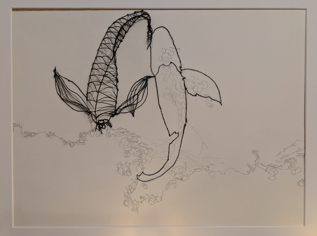 o.T, Acryl auf Metallplatte mit 3D-Druck, 2020Fische mit Seerosen, Bleistift auf Papier mit 3D-Druck, 2019Bahnhofswand I, Acryl auf Leinwand mit 3D-Druck, 2022Bahnhofswand II, Acryl auf Leinwand, 2020